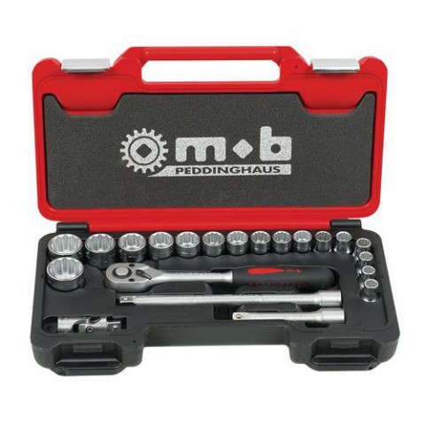 17 hlavic: 8/10/11/12/13/14/15/16/17/18/19/21/22/24/27/30/32 mm. Součástí sady je 1 ráčnový kloub a 1 univerzální kloub. 2 rozšíření: 125 a 250 mm.Sada ráčen Mob, 12 ks