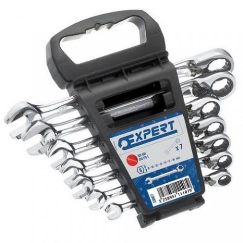 Sedmidílná sada očkoplochých ráčnových klíčů s páčkou. Pro prodloužení životnosti klíče zajišťuje profil očka maximální styčnou plochu přenosu síly na matice. Klíče splňují normy ISO 691 - ISO 1711-1. Kapacita (rozměry): 8; 10; 12; 13; 14; 17; 19 mmSada ráčnových očkoplochých klíčů, 7 ks