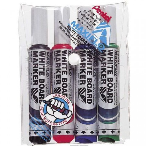 Za sucha stíratelné popisovače na bílé tabule. Fixy s kulatým hrotem mají sytou a kvalitní stopu. Pumpička na konci popisovače zajišťuje přísun tekutého inkoustu do hrotu. Vhodné i pro psané ve svislé poloze. Stav inkoustu je možné kontrolovat díky průhlednému obalu.Set popisovačů Pentel - černá, modrá, červená, zelená