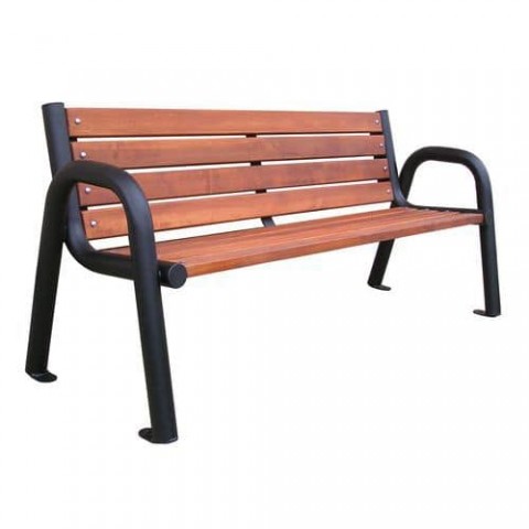 Moderní designová lavička do parků, na hřiště a jiná venkovní prostranství. Sedák a opěradlo vyrobené z tvrdého dřeva olše. Prkna jsou frézovaná, leštěná a 2x ošetřená impregnací v mahagonové barvě. Tloušťka latí 35 mm. Desky mají předvrtané otvory pro šrouby. Pevná konstrukce vyrobená z ocelových profilů o průměru 60 mm v černém provedení.Skandinávská lavička s područkou - šířka 180 cm