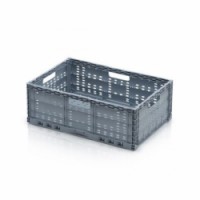 Skládací přepravky pro všestranné využití. Perforace umožňuje přístup vzduchu a odtok nežádoucích kapalin. Lze stohovat více přepravek na sebe. Vyrobené z polypropylenu. Rozměry složené přepravky 60 x 40 x 3,5 cm a 60 x 40 x 3,7 cm.Skládací perforované přepravky PP, šedé