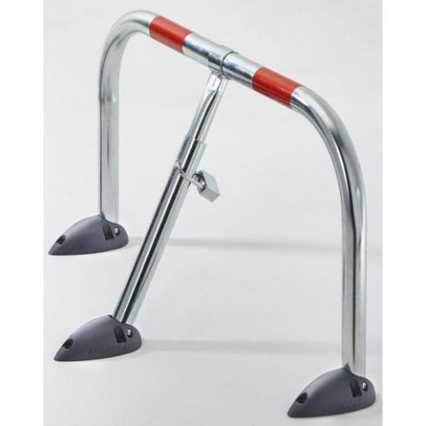 Parkovací zábrana s pevnou základnou, která odolává tlaku až 10 tun. 2 červené fluorescenční proužky pro lepší viditelnost zábrany. Zamykání pomocí visacího zámku, který je dodáván se dvěma klíči. K ukotvení do země.Sklopná parkovací zábrana Standard
