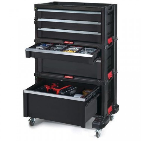 Plastová skříň na kolečkách, která obsahuje jednu hlubokou zásuvku s odnímatelnými přihrádkami na větší a těžší nástroje. Ostatní zásuvky mají odnímatelné organizéry s vysokou kapacitou, které umožnují ukládat různé nástroje dle velikosti. Vyrobeno z odolného a snadno omyvatelného plastu. Vhodné do dílen a garáží.Skříň na nářadí Curver s kolečky, 6 zásuvek