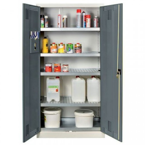 Skříně pro uložení chemických látek ve vlastním obalu. Uložené kapaliny stojí na roštu a tím nezmenšují záchytný objem polic. Skříň obsahuje 4 záchytné police s roštem o záchytném objemu 19 l na polici a spodní záchytnou vanu bez roštu o objemu 20 l. Dvoubodové uzamykání cylindrickým zámkem na klíč. Vyztužené dveře s větracími otvory uložené na vnitřních čepech lze otevřít do úhlu 110°.Skříně na uskladnění kapalin, 1950 x 950 x 500 mm