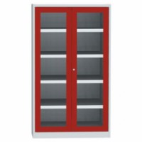 Skříně slouží k uložení chemických látek ve vlastním obalu. Uložené kapaliny stojí na roštu a tím nezmenšují záchytný objem polic. Skříň obsahuje 4 záchytné police s roštem o záchytném objemu 19 l na polici a spodní záchytnou vanu bez roštu o objemu 20 l. Dvoubodové uzamykání cylindrickým zámkem na klíč. Prosklené dveře uložené na vnitřních čepech lze otevřít do úhlu 110°. Povrchová úprava konstrukce práškovým lakem v barvě RAL. Kalené sklo tlošťky 4 cm.Skříně se skleněnými dveřmi na uskladnění chemikálií, 1950 x 1200 x 500 mm