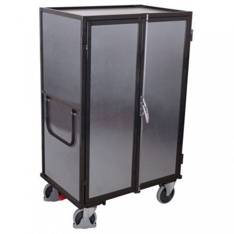 Vysoké vozíky s plnými stěnami z pozinkovaného plechu a křídlovými dveřmi. Závorové uzavírání s pákou a uzamykání na klíč. Ložná plocha z MDF desky. Sklopné tažné madlo. Možnost umístění polic v krocích po 100 mm. 2 pevná a 2 otočná kola s brzdou EasySTOP. Šedá kola z termoplastické pryže nezanechávající stopy na plastovém ráfku s přesnými kuličkovými ložisky.Skříňové policové vozíky s křídlovými dveřmi, do 500 kg