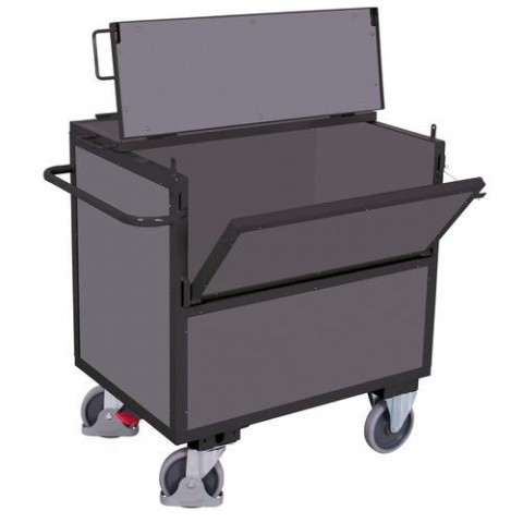 Skříňový vozík s výklopnou boční stěnou a odklopným víkem. Ložná plocha a stěny z MDF desek, výška stěny 80 cm. Možnost uzamčení visacím zámkem (není součástí dodání). 2 pevná a 2 otočná kola s brzdou EasySTOP. Šedá kola z termoplastické pryže nezanechávající stopy na plastovém ráfku s přesnými kuličkovými ložisky.Skříňové vozíky s výklopnou stěnou a víkem, do 500 kg