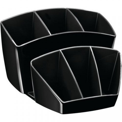 Plastový stojan na propisky, tužky, zvýrazňovače, CD a další kancelářské potřeby. Chytrý stojan na tužky umožňuje mít vše potřebné po ruce. Tři vysoké přihrádky pro psací potřeby, tři nízké přihrádky pro kancelářské sponky aj. drobný materiál. Mezi přihrádkami je prostor vhodný na bloky papírků nebo vizitek a na zadní stranu lze umístit CD. Vyrobený z černého lesklého polystyrenu v moderním designu.Stojánek na tužky CEP, 8 přihrádek