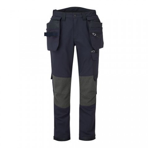 Kalhoty EV4 Stretch Holster poskytují vylepšený ergonomický design a využívají cílené umístění laserem vyřezávaných ventilačních otvorů, které zajišťují maximální rozsah ventilace při práci. Kalhoty mají vzadu vysoký pas s boční elastickou úpravou, která zajišťuje ochranu ve všech pracovních polohách. Předsazené kapsy s nastavitelným horním zatížením, velkoryse dimenzované přední kapsy a multifunkční stehenní kapsy na zip nabízejí bezpečné uložení telefonu, per a nářadí. Trojité prošití v celé délce pro maximální odolnost. Čtyřsměrně strečová nylonová tkanina pro větší odolnost a snadný pohyb Laserem vyřezané otvory pro dodatečné větrání Kapsy na kolenní chrániče s bočním vstupem Dvoustupňové kolenní kapsy umožňují dvě možnosti umístění Vnitřní klip na boty k upevnění kalhot k botě a zabránění jejich vyhrnování Víceúčelové kapsy Nastavitelný lem FlexiHem™ zajišťuje kalhoty u kotníku a pevně je drží na místě, čímž snižuje jejich zachycení 17 kapes pro dostatek úložného prostoru, včetně Strečové služební kalhoty EV4, tmavě modrá