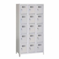 Svařované boxové skříně s odlehčenou konstrukcí a výztuhami zajišťujícími dobrou stabilitu. Vhodné pro odkládání osobních věcí na pracovištích, kulturních akcích, v převlékárnách apod. Vyrobeno z ocelového plechu tloušťky 0,5 mm. Perforovaná dvířka zavěšená na vnitřních pantech zajišťují účinné odvětrávání vnitřního prostoru. Jednotlivé boxy jsou samostatně uzamykatelné cylindrickým zámkem s možností výměny za otočný uzávěr (nutno dokoupit zvlášť). Možnost umístění štítku se jménem.Svařované šatní skříně Eric odlehčené, 15 boxů, cylindrický zámek