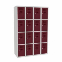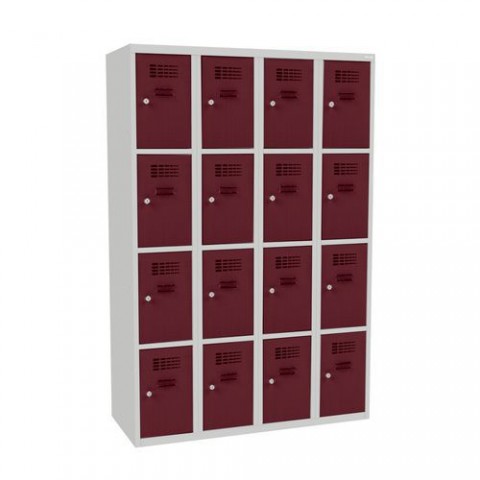 Svařované šatní skříně s boxy v několika barevných variantách, vhodné pro odkládání osobních věcí zaměstnanců na pracovištích, v převlékárnách nebo sportovních klubech. Odlehčená konstrukce z ocelového plechu tloušťky 0,5 mm s výztuhami zajišťuje dobrou stabilitu. Účinné odvádění vlhkosti z oděvů větracími otvory na dveřích. Dvířka boxů jsou zavěšená na vnitřních pantech. Uzamykání každého boxu cylindrickým zámkem, který je možné vyměnit za otočný uzávěr. Možnost umístění štítku se jménem v horní části dveří.Svařované šatní skříně George, 16 boxů, cylindrický zámek
