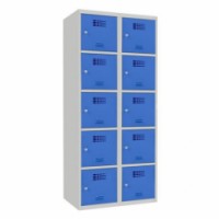 Svařované šatní skříně s boxy v několika barevných variantách, vhodné pro odkládání osobních věcí zaměstnanců na pracovištích, v převlékárnách nebo sportovních klubech. Odlehčená konstrukce z ocelového plechu tloušťky 0,5 mm s výztuhami zajišťuje dobrou stabilitu. Účinné odvádění vlhkosti z oděvů větracími otvory na dveřích. Dvířka boxů jsou zavěšená na vnitřních pantech. Uzamykání každého boxu cylindrickým zámkem, který je možné vyměnit za otočný uzávěr. Možnost umístění štítku se jménem v dolní části dveří.Svařované šatní skříně Samuel, 10 boxů, cylindrický zámek