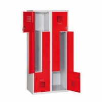 Svařované boxové šatní skříňky v několika barevných variantách, vhodné pro odkládání věcí na pracovištích, převlékárnách nebo sportovních klubech. Odlehčená konstrukce z ocelového plechu tloušťky 0,5 mm s výztuhami zajišťující dobrou stabilitu. Účinné odvádění vlhkosti z oděvů větracími otvory. Dvířka boxů jsou zavěšena na vnějších pantech. Uzamykání každého boxu cylindrickým zámkem s možností výměny za otočný uzávěr (nutné dokoupit zvlášť). Možnost umístění štítku se jménem na dvířka. Vnitřní rozměry oddílu (v x š): 129 x 35 a 17,3 x 49 cm.Svařované šatní skříně Steven, dveře Z, 4 oddíly, cylindrický zámek