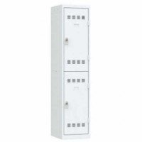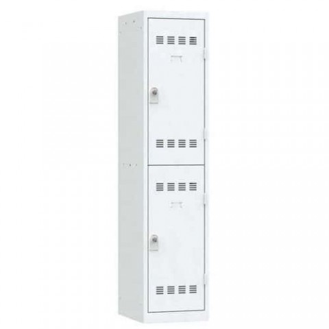 Více-oddílová šatní skříň svařovaná z ocelového plechu tloušťky 0,7 mm. Každý oddíl je vybaven tyčí na ramínka a dvěma háčky (uzamykání otočným uzávěrem na visací zámek - není součástí dodávky). Perforovaná dvířka zajišťují účinné odvětrávání vnitřního prostoru. Možnost umístění štítku se jménem.Svařované šatní skříně Vinco, 1 sloupec, 2 boxy, 400 mm, otočný uzávěr