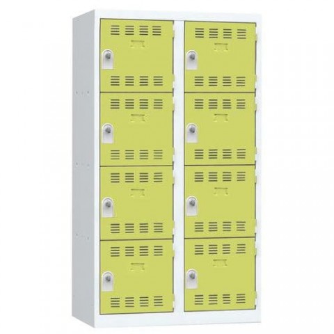 Více-oddílová šatní skříň svařovaná z ocelového plechu tloušťky 0,7 mm. Jednotlivé oddíly jsou samostatně uzamykatelné otočným uzávěrem na visací zámek (není součástí dodávky). Perforovaná dvířka zajišťují účinné odvětrávání vnitřního prostoru. Možnost umístění štítku se jménem.Svařované šatní skříně Vinco, 2 sloupce, 8 boxů, 400 mm, otočný uzávěr