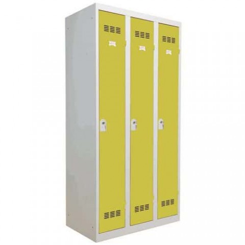 Šatní skříň svařovaná z ocelového plechu tloušťky 0,7 mm. Každý oddíl je vybaven tyčí na ramínka a dvěma háčky. Uzamykání jednobodovým cylindrickým zámkem se dvěma klíči. Perforovaná dvířka zajišťují účinné odvětrávání vnitřního prostoru, možnost umístění štítku se jménem.Svařované šatní skříně Vinco, 3 oddíly, 300 mm, cylindrický zámek