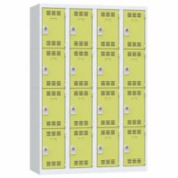 Více-oddílová šatní skříň svařovaná z ocelového plechu tloušťky 0,7 mm. Jednotlivé oddíly jsou samostatně uzamykatelné otočným uzávěrem na visací zámek (není součástí dodávky). Perforovaná dvířka zajišťují účinné odvětrávání vnitřního prostoru. Možnost umístění štítku se jménem.Svařované šatní skříně Vinco, 4 sloupce, 16 boxů, 300 mm, otočný uzávěr
