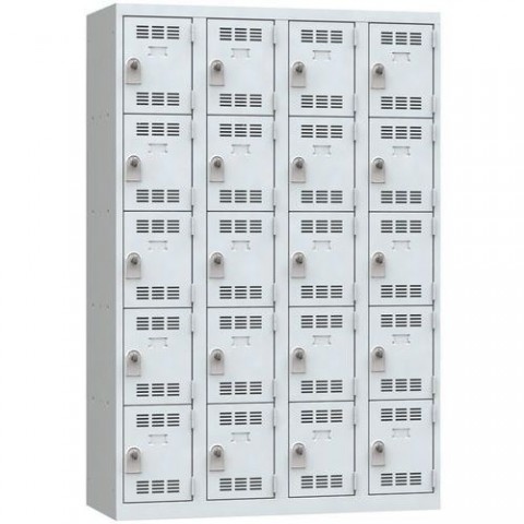Více-oddílová šatní skříň svařovaná z ocelového plechu tloušťky 0,7 mm. Jednotlivé oddíly jsou samostatně uzamykatelné otočným uzávěrem na visací zámek (není součástí dodávky). Perforovaná dvířka zajišťují účinné odvětrávání vnitřního prostoru. Možnost umístění štítku se jménem.Svařované šatní skříně Vinco, 4 sloupce, 20 boxů, 300 mm, otočný uzávěr