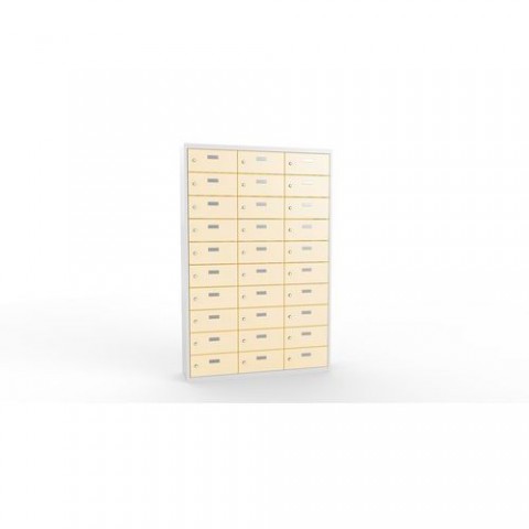 Skříně ze svařovaného plechu s malými schránkami na uložení osobních věcí. Vhodné do kantýny, posiloven, fitness center, bazenů nebo recepce hotelů. Jednotlivé schránky jsou samostatně uzamykatelné cylindrickým zámkem na klíč. Možnost vložení štítku se jménem nebo číslem na dvířka každé schránky.Svařované skříně na osobní věci Ron II, 30 boxů, cylindrický zámek
