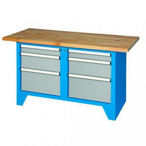 Dílenský stůl Redig s pracovní plochou z bukové spárovky disponuje šesti zásuvkami v různých velikostech ve dvou řadách. Zásuvky jsou opatřeny dvěma zámky pro centrální zamykání a popisovacími lištami. Na vyžádání lze stůl opatřit zadní zvýšenou hranou, oplechovat pracovní plochu popř. dodat v dalších barevných kombinacích dle stupnice RAL. rozměry v x š x h: 88 x 150 x 70 cm materiál: ocelový plech, tl. 1 mm nosnost: 800 kg rozměry pracovní desky v x š x h: 4 x 150 x 70 cm materiál pracovní desky: buková spárovka výška zásuvky: 2 x 10; 2 x 20; 2 x 30 cm nosnost zásuvky: 70 kg počet zásuvek: 6 ks výsuv zásuvky: 88 % barva pracovní desky: buk barva podnoží: modrá RAL 5012 barva zásuvek: šedá RAL 7035 hmotnost: 136 kg uzamykatelná skříňka cylindrickým zámkem - dva klíče, popisové lišty zásuvek, výsuv zásuvek čtyřmi kuličkovými ložisky, zkompletováno, povrchová úprava práškovým lakemSvařovaný dílenský stůl Redig, 88 x 150 x 70 cm