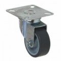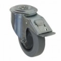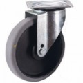 Otočná pojezdová kola z šedé termoplastické pryže na plastovém ráfku s přesnými kuličkovými ložisky. Tělo kola z elektricky vodivého polypropylenu, elektrický odpor menší než 1 000 000 ohmů. Šedý nešpinivý běhoun. Nízká hlučnost, nízký válivý odpor. Odolnost vůči teplotám od -20 do +80 °C, vysoká odolnost vůči opotřebení. Tvrdost 65° Shore A.Termoplastická pojezdová kola s přírubou ESD, průměr 125 - 200 mm, kuličkové ložisko, otočná s brzdou