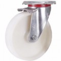 Bílé otočné pojezdové kolo z polyamidu s přesnými kuličkovými ložisky. Teplotní odolnost od -20 do +80 °C. Tvrdost 75° Shore D.Polyamidová pojezdová kola s přírubou, průměr 125 - 200 mm, kuličkové ložisko, otočná