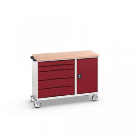Mobilní údržbový vozík Bott Verso s horní pracovní plochou tloušťky 3 cm typu multiplex/linoleum nebo ohraněný plech s rohoží. Nosnost až 200 kg, robustní svařovaná ocelová konstrukce, povrchová úprava práškovým lakem. Centrálně uzamykatelné zásuvky s výškou 2 x 10 a 3 x 17,5 cm, s nosností 50 kg a 100% výsuvem na válečkových ložiskách. Uzamykatelná skříňka s výškou dveří 72,5 cm, uvnitř pozinkovaná výškově nastavitelná police s nosností 75 kg. Ergonomické rukojeti zásuvek s popisovatelnou lištou, systém blokace otevření více zásuvek najednou. Dvě pevná a dvě otočná kola s brzdou o průměru 12,5 cm, manipulaci usnadňují madla.Údržový zásuvkový vozík Bott Verso, 98 x 130 x 55/60 cm, 5 zásuvek, skříňka, multiplex/linoleum/rohož