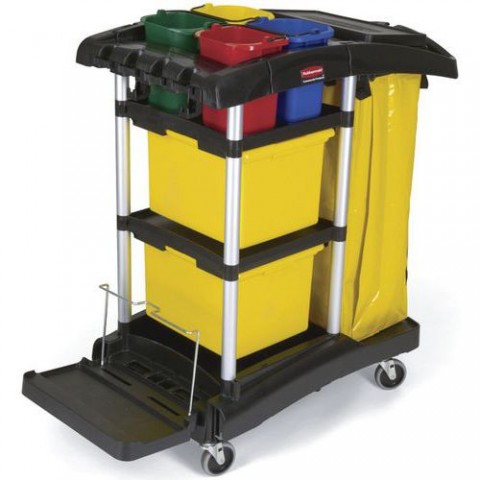 Vozík navržený pro zlepšení úrovně hygieny v citlivých prostředích a vhodný pro všechny úklidové systémy Rubbermaid s mikrovlákny. Úložné koše oddělují čisté a špinavé mopy Vybaven velkokapacitním vinylovým vakem (128 l), integrovanými gumovými držadly, 4 barevně odlišenými kbelíky, 2 úložnými koši, kovovým držákem mopů z mikrovláken a 2 háčky. Vybaveno otočnými kolečky, která nezanechávají stopy.Úklidový vozík pro Microfibre_Rubbermaid