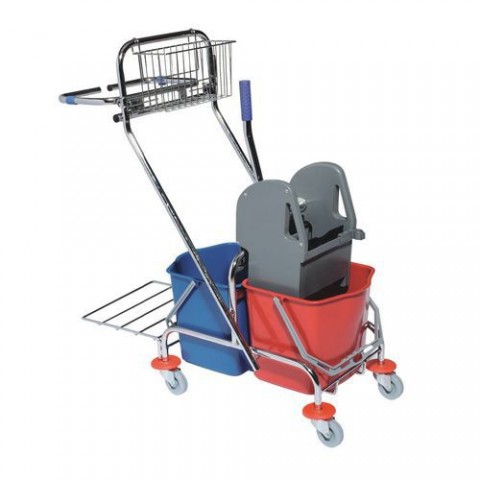 Vozík na úklid s pákovým ždímačem a se dvěma kbelíky o objemu 15 l. Konstrukce je vyrobená z chromované oceli. Vybaven držákem s plastovými sponami na odpadkové pytle. Mobilitu zajišťují 4 otočná kola s chrániči nábytku.Úklidový vozík s pákovým ždímačem, objem 2 x 15 l
