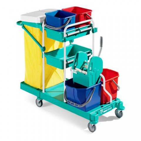 Víceúčelový vozík na úklid se dvěma 15l nádobami s úchytem. Dvě police 27 x 44 cm s dvěma 12l kbelíky a pro uložení mycích prostředků. Držák na odpadkové pytle pro objem pytle 120 l. Polypropylenová základna se čtyřmi 100mm kolečky slouží také jako odkládací prostor. Rukojeť pro lepší manipulaci s vozíkem.Úklidový vozík s pákovým ždímačem TTS, objem 2 x 15 l a 2 x 12 l