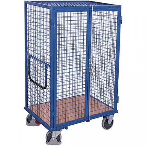 Klecové vozíky s mřížovými bočnicemi a stropem, rozměr oka 50 x 50 mm. Dvoukřídlé dveře s pákovým uzavíráním na klíč. Ložná plocha z MDF desky. Sklopné tažné madlo. 2 pevná a 2 otočná kola s brzdou EasySTOP. Šedá kola z termoplastické pryže nezanechávající stopy na plastovém ráfku s přesnými kuličkovými ložisky.Vysoké klecové vozíky s křídlovými dveřmi, do 500 kg