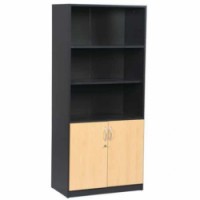 Knihovna se spodní uzamykatelnou skříňkou vhodná do kanceláří. Vyrobená z dřevotřískových desek. Vybavená dvěma pevnými policemi v horní částí a jednou výškově nastavitelnou policí ve spodní skříňce. Kovové úchytky v barvě hliníku. Nastavitelné vyrovnávací nožky.Vysoké skříně Simmob Quatuor, 180 x 80 x 47 cm, s nikou a dvířky