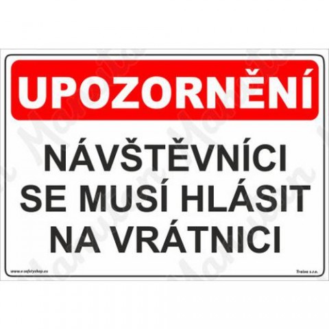 Tabulky, značky a samolepky "Návštěvníci se musí hlásit na vrátnici" jsou tištěny na vysoce kvalitním materiálu, barvami s vysokou odolností proti otěru a UV záření. Provedení je plně v souladu s požadavky právních a technických předpisů, zejména Nařízení vlády č. 375/2017 Sb., ČSN ISO 3864-1, ČSN ISO 3864-2, ČSN ISO 3864-3, ČSN ISO 3864-4. Používá se k označení míst a objektů, kde se návtěvníci musí hlásit na vrátnici.Výstražné tabulky - Návštěvníci se musí hlásit na vrátnici