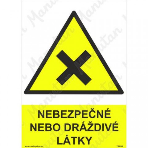 Bezpečnostní značka, tabulka nebo samolepka "Nebezpečné nebo dráždivé látky" je tištěna na vysoce kvalitním materiálu, barvami s vysokou odolností proti otěru a UV záření. Provedení plně odpovídá požadavkům právních a technických předpisů, zejména Nařízení vlády č. 375/2017 Sb., ČSN ISO 3864-1, ČSN ISO 3864-2, ČSN ISO 3864-3, ČSN ISO 3864-4.Výstražné tabulky - Nebezpečné nebo dráždivé látky