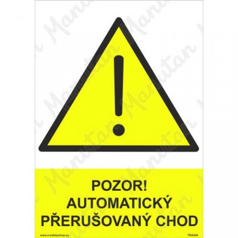 Bezpečnostní značení tabulkou, značkou nebo samolepkou "Pozor automatický přerušovaný chod" tiskneme na vysoce kvalitním materiálu, barvami s vysokou odolností proti otěru a UV záření. Tím zajišťujeme splnění požadavků Nařízení vlády č. 375/2017 Sb., ČSN ISO 3864-1, ČSN ISO 3864-2, ČSN ISO 3864-3, ČSN ISO 3864-4.Výstražné tabulky - Pozor automatický přerušovaný chod