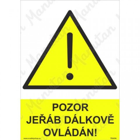 Bezpečnostní značení tabulkou, značkou nebo samolepkou "Pozor jeřáb dálkově ovládán" tiskneme na vysoce kvalitním materiálu, barvami s vysokou odolností proti otěru a UV záření. Tím zajišťujeme splnění požadavků Nařízení vlády č. 375/2017 Sb., ČSN ISO 3864-1, ČSN ISO 3864-2, ČSN ISO 3864-3, ČSN ISO 3864-4. Upozorňuje na pracovní prostor dálkově ovládaného jeřábu.Výstražné tabulky - Pozor jeřáb dálkově ovládán