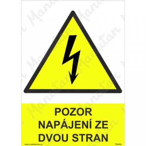 Bezpečnostní značka, tabulka nebo samolepka "Pozor napájení ze dvou stran" je tištěna na vysoce kvalitním materiálu, barvami s vysokou odolností proti otěru a UV záření. Provedení plně odpovídá požadavkům právních a technických předpisů, zejména Nařízení vlády č. 375/2017 Sb., ČSN ISO 3864-1, ČSN ISO 3864-2, ČSN ISO 3864-3, ČSN ISO 3864-4.Výstražné tabulky - Pozor napájení ze dvou stran