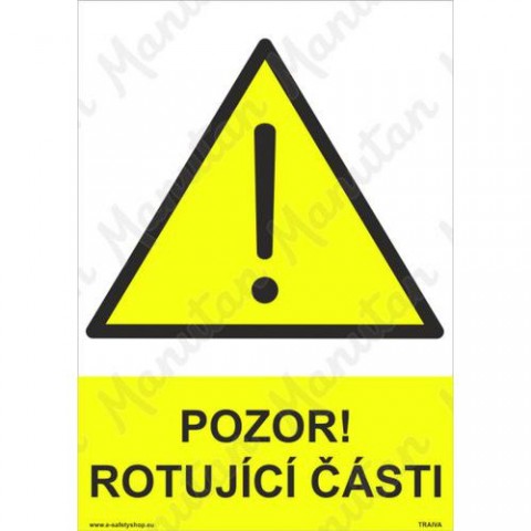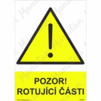Bezpečnostní značení tabulkou, značkou nebo samolepkou "Pozor rotující části" tiskneme na vysoce kvalitním materiálu, barvami s vysokou odolností proti otěru a UV záření. Tím zajišťujeme splnění požadavků Nařízení vlády č. 375/2017 Sb., ČSN ISO 3864-1, ČSN ISO 3864-2, ČSN ISO 3864-3, ČSN ISO 3864-4.Výstražné tabulky - Pozor rotující části