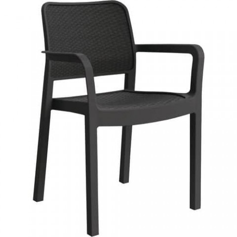 Jednoduché a kvalitní venkovní křeslo s ratanovým vzorem. Stabilní područky pro optimální komfort sezení. Odolné vůči povětrnostním vlivům, mechanickému poškození a UV záření. Jednoduchá údržba a čištění měkkým hadříkem s vodou a saponátem.Zahradní plastové židle Samanna