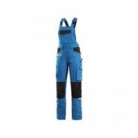 Dámské montérkové kalhoty s náprsenkou, strečová tkanina umožňující volný pohyb, náprsní kapsa s klopou, pas s poutky na opasek, přední kapsy s kapsou na zip, multifunkční kapsy na obou stranách, kolena zesílena 600D polyesterem, dvě zadní kapsy - je Velikost: 38-58 Reflexní doplňky: AnoZahradníky CXS STRETCH, dámské, středně modro-černé