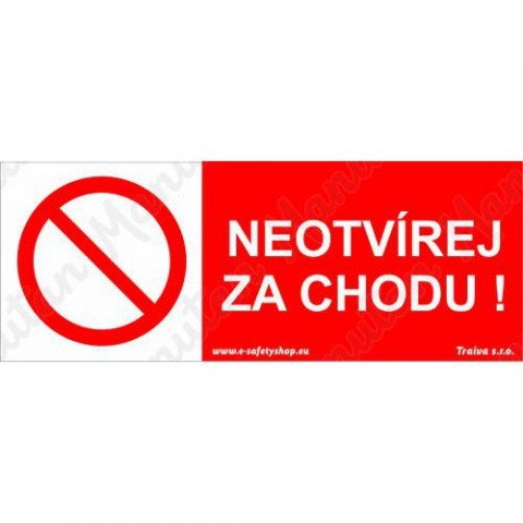 Bezpečnostní značení tabulkou, značkou nebo samolepkou "Neotvírej za chodu" tiskneme na vysoce kvalitním materiálu, barvami s vysokou odolností proti otěru a UV záření. Tím zajišťujeme splnění požadavků Nařízení vlády č. 375/2017 Sb., ČSN ISO 3864-1, ČSN ISO 3864-2, ČSN ISO 3864-3, ČSN ISO 3864-4. Používá se k označení zařízení, které je z bezpečnostních důvodů zakázáno otvírat za chodu.Zákazové tabulky - Neotvírej za chodu