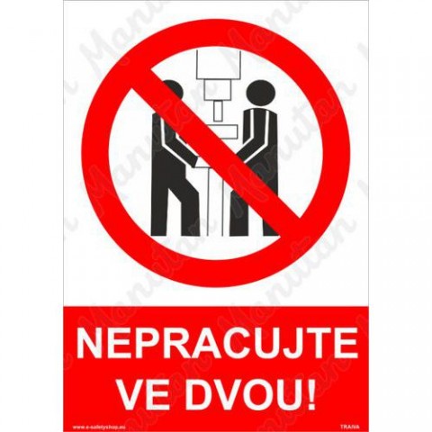 Bezpečnostní značení tabulkou, značkou nebo samolepkou "Nepracujte ve dvou" tiskneme na vysoce kvalitním materiálu, barvami s vysokou odolností proti otěru a UV záření. Tím zajišťujeme splnění požadavků Nařízení vlády č. 375/2017 Sb., ČSN ISO 3864-1, ČSN ISO 3864-2, ČSN ISO 3864-3, ČSN ISO 3864-4. Používá se k označení stroje, na kterém smí z bezpečnostních důvodů pracovat pouze jeden pracovník.Zákazové tabulky - Nepracujte ve dvou