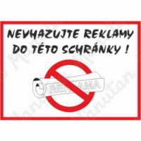 Značky, tabulky a samolepky "Nevhazujte reklamy do této schránky" tiskneme na velmi kvalitním materiálu, barvami s vysokou odolností proti otěru a UV záření. Tak, aby provedení značení bylo plně v souladu s Nařízením vlády č. 375/2017 Sb., ČSN ISO 3864 a ČSN ISO 3864-1. Používá se k označení poštovních schránek, do kterých nechcete vhazovat reklamy.Zákazové tabulky - Nevhazujte reklamy do této schránky