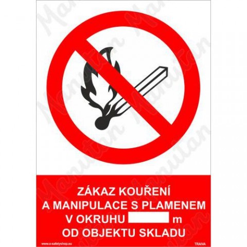 Bezpečnostní značka, tabulka nebo samolepka "Zákaz kouření a manipulace s plamenem v okruhu . . . m od skladu" plně odpovídá požadavkům právních a technických předpisů, zejména Nařízení vlády č. 375/2017 Sb., ČSN ISO 3864-1, ČSN ISO 3864-2, ČSN ISO 3864-3, ČSN ISO 3864-4. Bezpečnostní tabulka slouží k vymezení prostoru, kde je zakázáno kouření a manipulace s plamenem v určitém okruhu od skladu.Zákazové tabulky - Zákaz kouření a manipulace s plamenem v okruhu m od skladu