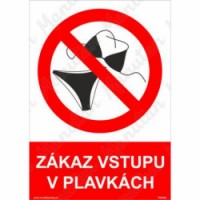 Bezpečnostní značení tabulkou, značkou nebo samolepkou "Zákaz vstupu v plavkách" tiskneme na vysoce kvalitním materiálu, barvami s vysokou odolností proti otěru a UV záření. Tím zajišťujeme splnění požadavků Nařízení vlády č. 375/2017 Sb., ČSN ISO 3864-1, ČSN ISO 3864-2, ČSN ISO 3864-3, ČSN ISO 3864-4. Používá se k označení prostor, ve kterých je z hygienických důvodů zákaz vstupu v plavkách, např. sauna, wellnes.Zákazové tabulky - Zákaz vstupu v plavkách