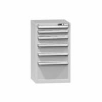 Zásuvková skříň je opatřená mechanismem centrálního zamykání a blokace zásuvek. Zásuvky jsou základním skladovacím prvkem, a proto splňují vysoké požadavky na pevnost a stabilitu. Korpusy zásuvkových skříní tvoří svařenec jednotlivých konstrukčních dílů z kvalitních ocelových plechů. Vnitřní konstrukce korpusů je opatřena perforací po 25 mm. Tuto perforaci využíváme k uchycení vodicích lišt zásuvek, jejich výškovému uspořádání a nakonfigurování požadované zásuvkové sestavy. Přestavování vodicích lišt nebo háčků polic probíhá jednoduše a velice rychle bez použití nástrojů.Zásuvkové skříně ZA4, 578 x 600 x 990 mm