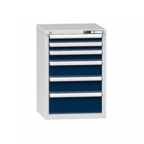 Zásuvková skříň je opatřená mechanismem centrálního zamykání a blokace zásuvek. Zásuvky jsou základním skladovacím prvkem, a proto splňují vysoké požadavky na pevnost a stabilitu. Korpusy zásuvkových skříní tvoří svařenec jednotlivých konstrukčních dílů z kvalitních ocelových plechů. Vnitřní konstrukce korpusů je opatřena perforací po 25 mm. Tuto perforaci využíváme k uchycení vodicích lišt zásuvek, jejich výškovému uspořádání a nakonfigurování požadované zásuvkové sestavy. Přestavování vodicích lišt nebo háčků polic probíhá jednoduše a velice rychle bez použití nástrojů.Zásuvkové skříně ZA7, 578 x 600 x 840 mm