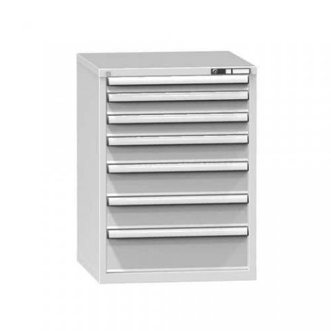 Zásuvková skříň je opatřená mechanismem centrálního zamykání a blokace zásuvek. Zásuvky jsou základním skladovacím prvkem, a proto splňují vysoké požadavky na pevnost a stabilitu. Korpusy zásuvkových skříní tvoří svařenec jednotlivých konstrukčních dílů z kvalitních ocelových plechů. Vnitřní konstrukce korpusů je opatřena perforací po 25 mm. Tuto perforaci využíváme k uchycení vodicích lišt zásuvek, jejich výškovému uspořádání a nakonfigurování požadované zásuvkové sestavy. Přestavování vodicích lišt nebo háčků polic probíhá jednoduše a velice rychle bez použití nástrojů.Zásuvkové skříně ZB6, 731 x 753 x 990 mm
