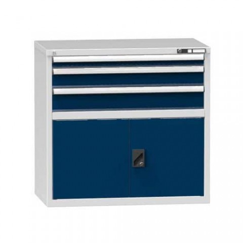 Zásuvková skříň je opatřená mechanismem centrálního zamykání a blokace zásuvek. Zásuvky jsou základním skladovacím prvkem, a proto splňují vysoké požadavky na pevnost a stabilitu. Korpusy zásuvkových skříní tvoří svařenec jednotlivých konstrukčních dílů z kvalitních ocelových plechů. Vnitřní konstrukce korpusů je opatřena perforací po 25 mm. Tuto perforaci využíváme k uchycení vodicích lišt zásuvek, jejich výškovému uspořádání a nakonfigurování požadované zásuvkové sestavy. Přestavování vodicích lišt nebo háčků polic probíhá jednoduše a velice rychle bez použití nástrojů.Zásuvkové skříně ZC2, 1037 x 600 x 990 mm