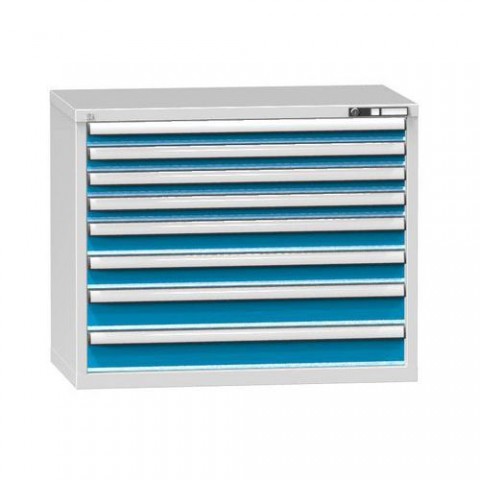 Zásuvková skříň je opatřená mechanismem centrálního zamykání a blokace zásuvek. Zásuvky jsou základním skladovacím prvkem, a proto splňují vysoké požadavky na pevnost a stabilitu. Korpusy zásuvkových skříní tvoří svařenec jednotlivých konstrukčních dílů z kvalitních ocelových plechů. Vnitřní konstrukce korpusů je opatřena perforací po 25 mm. Tuto perforaci využíváme k uchycení vodicích lišt zásuvek, jejich výškovému uspořádání a nakonfigurování požadované zásuvkové sestavy. Přestavování vodicích lišt nebo háčků polic probíhá jednoduše a velice rychle bez použití nástrojů.Zásuvkové skříně ZC8, 1037 x 600 x 840 mm